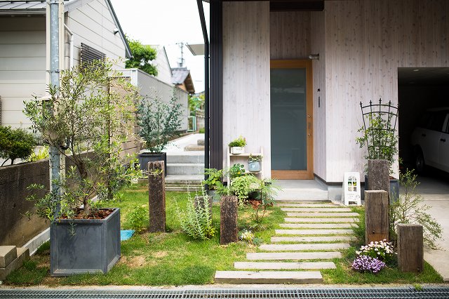 「吉作のいえ」におけるアプローチ部分と庭部分の植栽・外構計画。